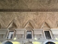 Teto do coro alto com estuques ornamentais, revelando a elegância e a sobriedade do barroco português.