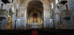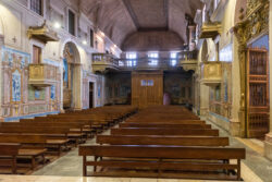 Vista panorâmica do teto em abóbada com estuques cinzentos ao longo da nave da igreja. Ao fundo, o altar com nicho dourado emoldurado por arco de volta perfeita.