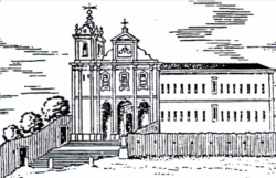 Um grupo de religiosos recebe um nobre visitante com súbditos, sugerindo um episódio de intercessão, conversão ou reconhecimento eclesial.